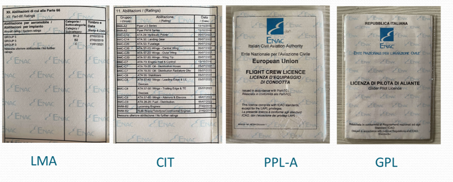 Licenze di manutenzione approvate secondo lo standard nazionale ENAC ed europeo EASA Part 66 per la manutenzione di aeromobili e componenti.